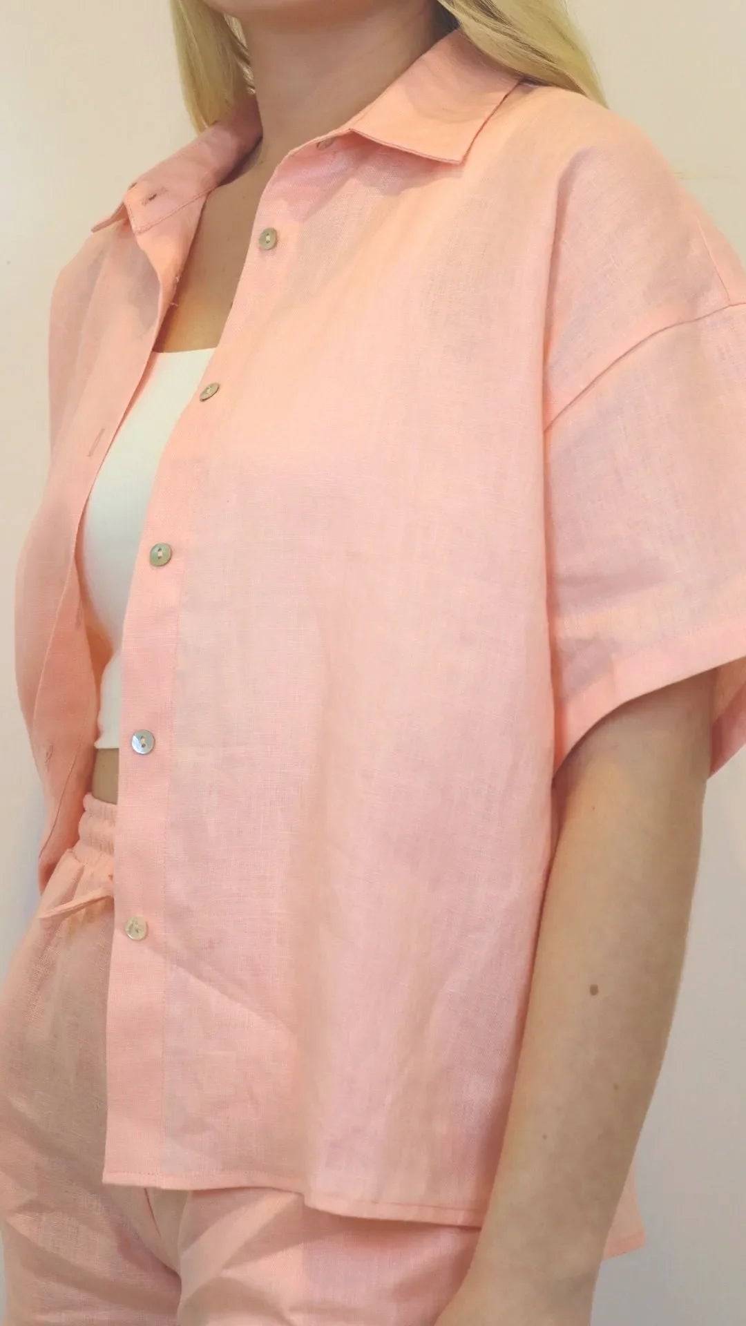 The Linen Oversized Short-Sleeved Shirt in pink is the perfect blend of relaxed sophistication and sustainability.