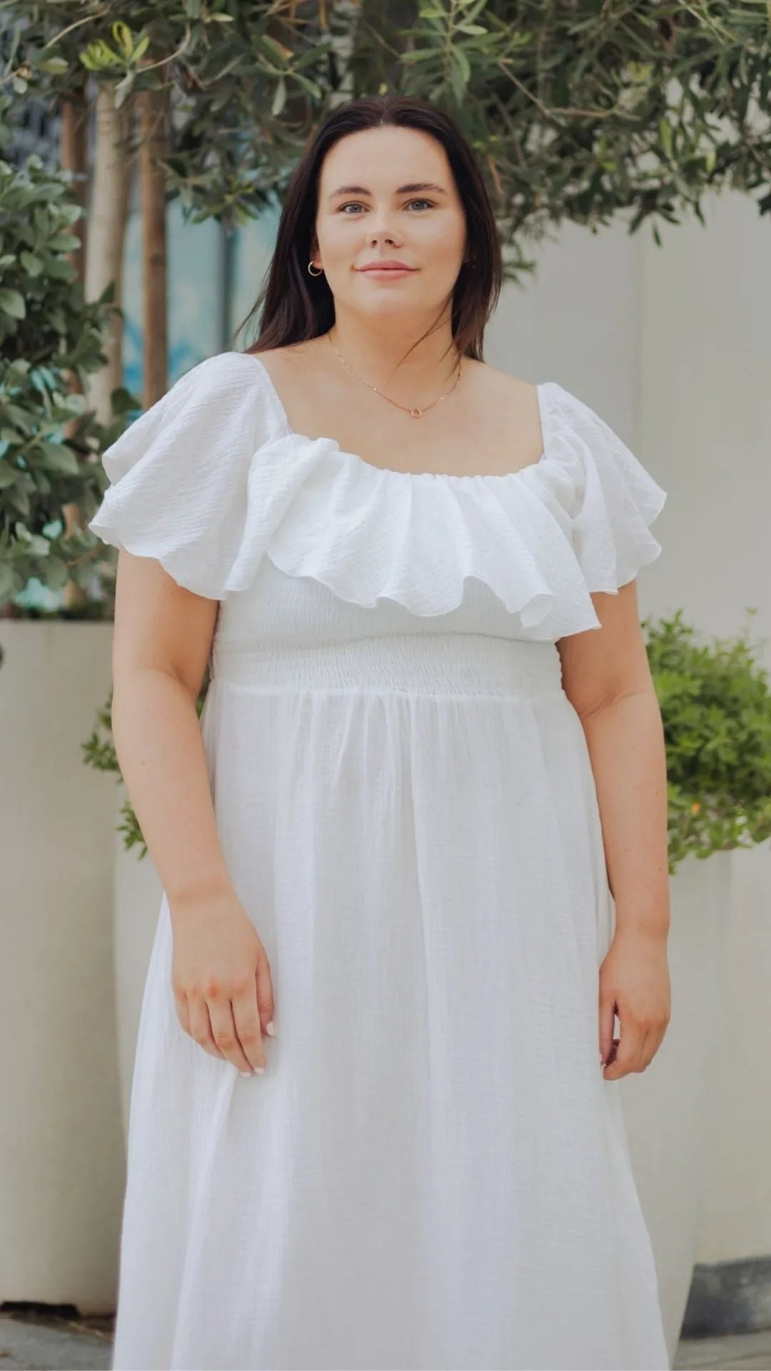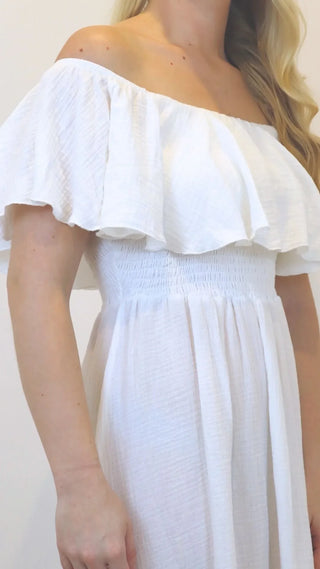 The Off The Shoulder Long Dress in white is a timeless and effortlessly elegant staple, crafted from 100% organic cottonfor a soft, breathable, and sustainable fit.