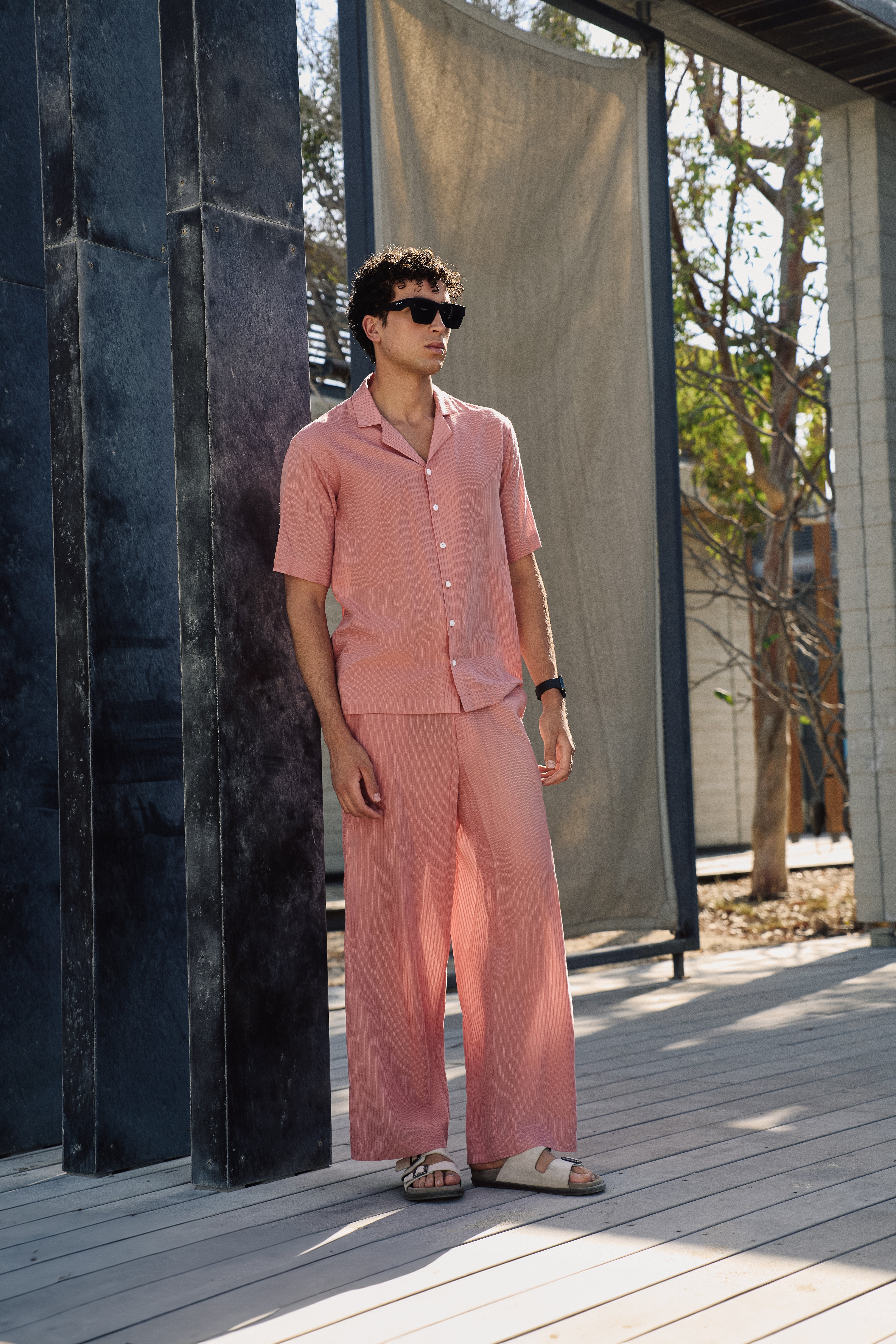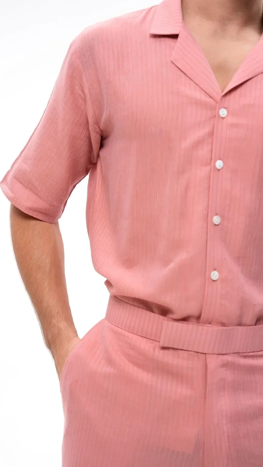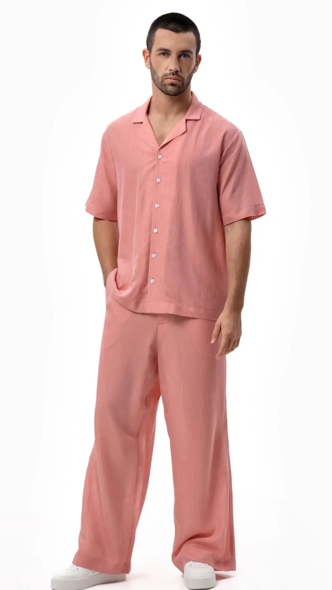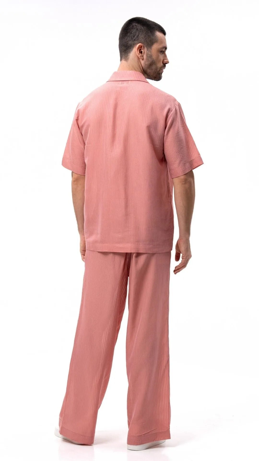 Designed for effortless elegance, the Banana Stripe Wide Fit Trousers combine sustainability and style. Made from 100% banana fiber, the Banana Stripe Wide Fit Trousers offer a breathable, lightweight fit perfect for all-day wear. The dusty pink hue enhances their versatility, while the slight stripe pattern adds refined texture. Crafted with Ecological Plant Fiber Certified (EPFC) fabric, the Banana Stripe Wide Fit Trousers prioritize ethical fashion without compromising on style. True to size, the Banana Stripe Wide Fit Trousers feature a relaxed, wide-leg fit, making them a standout addition to your collection.